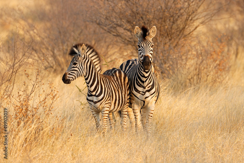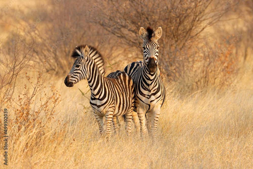 The watermark will not be included on Wall mural.: Two plains zebras (equus burchelli) in natural habitat, south africa -