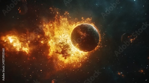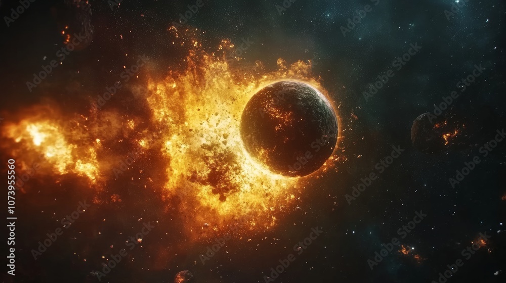 The watermark will not be included on Wall mural.: Two planets collide and explode in the deep space