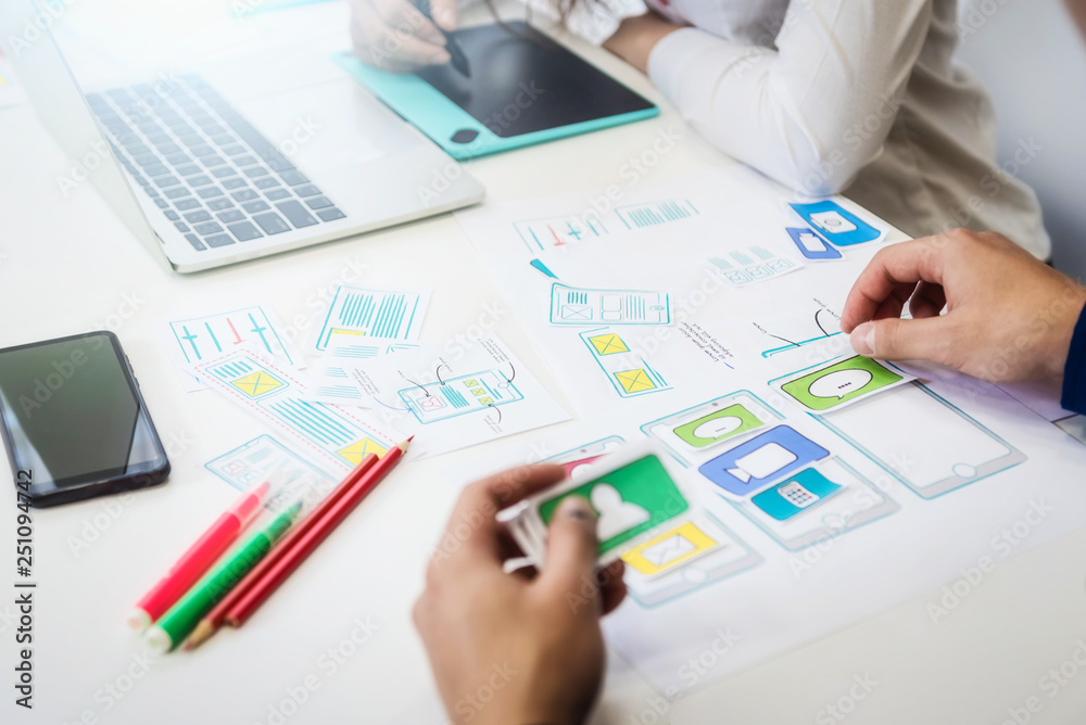 The watermark will not be included on Wall mural.: Two programmer discussing new project for developing technologies application designe of mobile phon