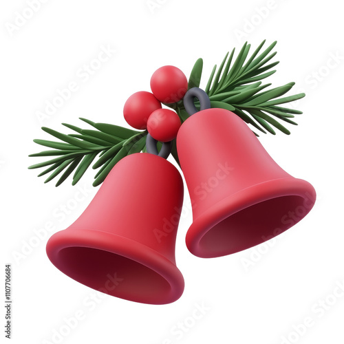 The watermark will not be included on Wall mural.: Two red christmas bells with pine 3d render icon isolated on transparent background cutout
