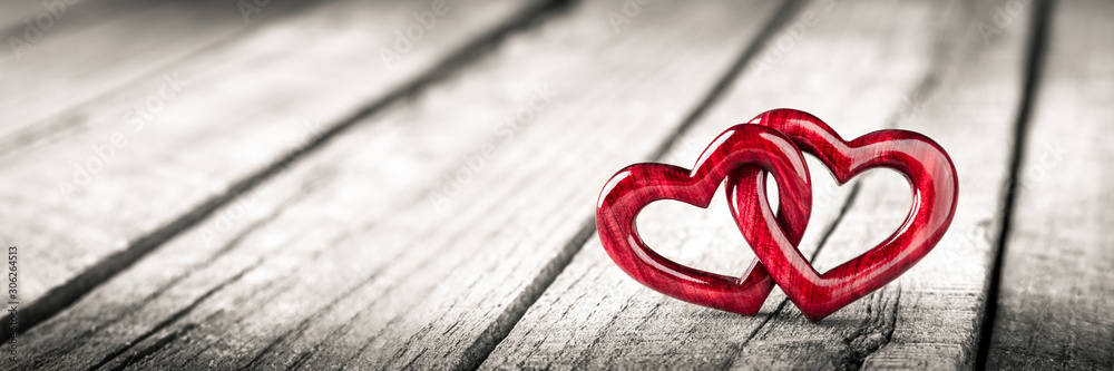 Wall mural two red wooden interlocking hearts with high gloss finish on rustic wood table - valentine's day con - Wall murals Wall mural two red wooden interlocking hearts with high gloss finish on rustic wood table - valentine's day con - Wall murals