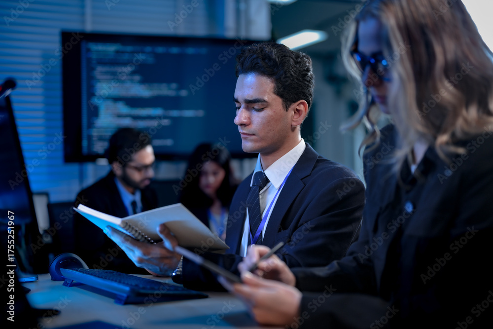 Wall mural two software developers smile with satisfaction during a pair programming session, as one points to  - Wall murals Wall mural two software developers smile with satisfaction during a pair programming session, as one points to - Wall murals