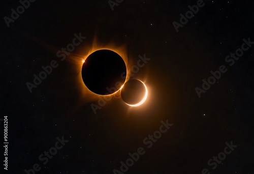 Wall mural two stars in close orbit, with one star passing in front of the other, creating an eclipse and a uni - Wall murals Wall mural two stars in close orbit, with one star passing in front of the other, creating an eclipse and a uni - Wall murals