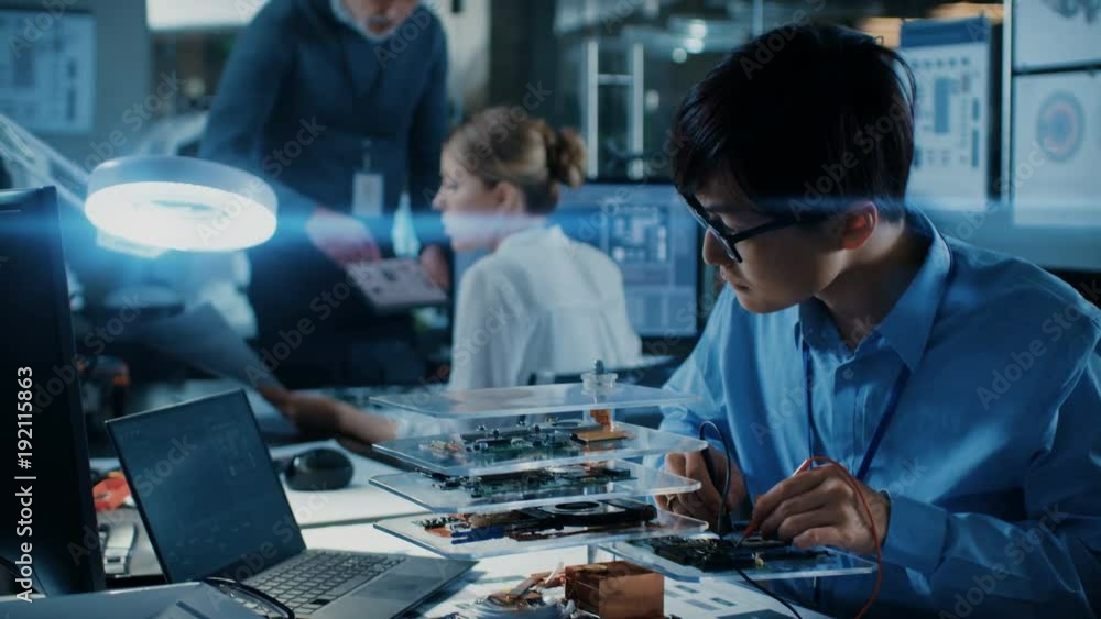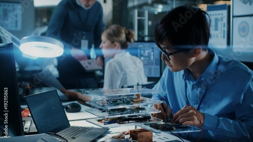The watermark will not be included on Wall mural.: Two talented engineers work with three dimensional printer, they've created unique component - they w