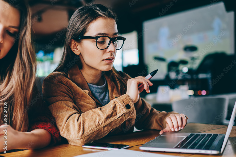 Two talented female designers searching information for sketch using laptop device and cafeteria wifWall mural