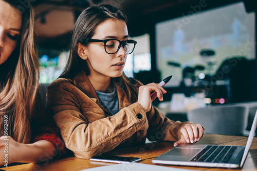 The watermark will not be included on Wall mural.: Two talented female designers searching information for sketch using laptop device and cafeteria wif