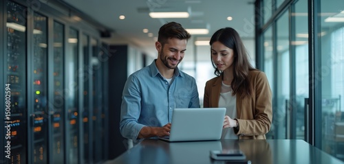 Two tech engineers discuss ai software in modern office - smiling man, woman look at laptop computer,Wall mural