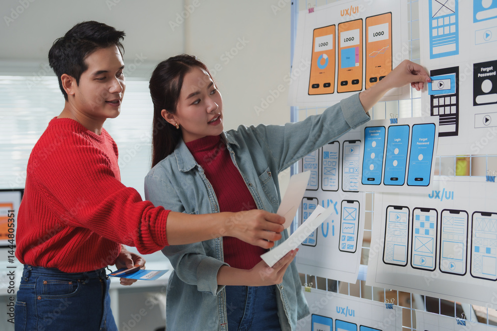 Wall mural two young ux ui designers are discussing and analyzing mobile application wireframe sketches on a wh - Wall murals Wall mural two young ux ui designers are discussing and analyzing mobile application wireframe sketches on a wh - Wall murals