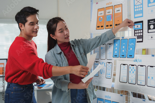 The watermark will not be included on Wall mural.: Two young ux ui designers are discussing and analyzing mobile application wireframe sketches on a wh