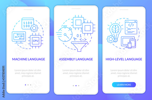 Wall mural : Types of computer languages blue gradient onboarding mobile app screen - walkthrough 3 steps graphic
