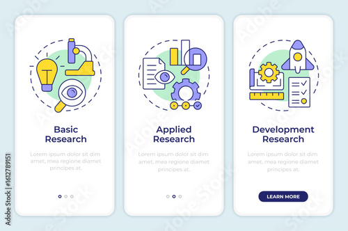 Wall mural : Types of research and development onboarding mobile app screen - walkthrough 3 steps editable graphic