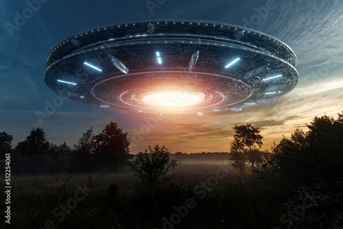 Wall mural ufo, an alien saucer hovering above the field in the clouds, hovering motionless in the sky. unident