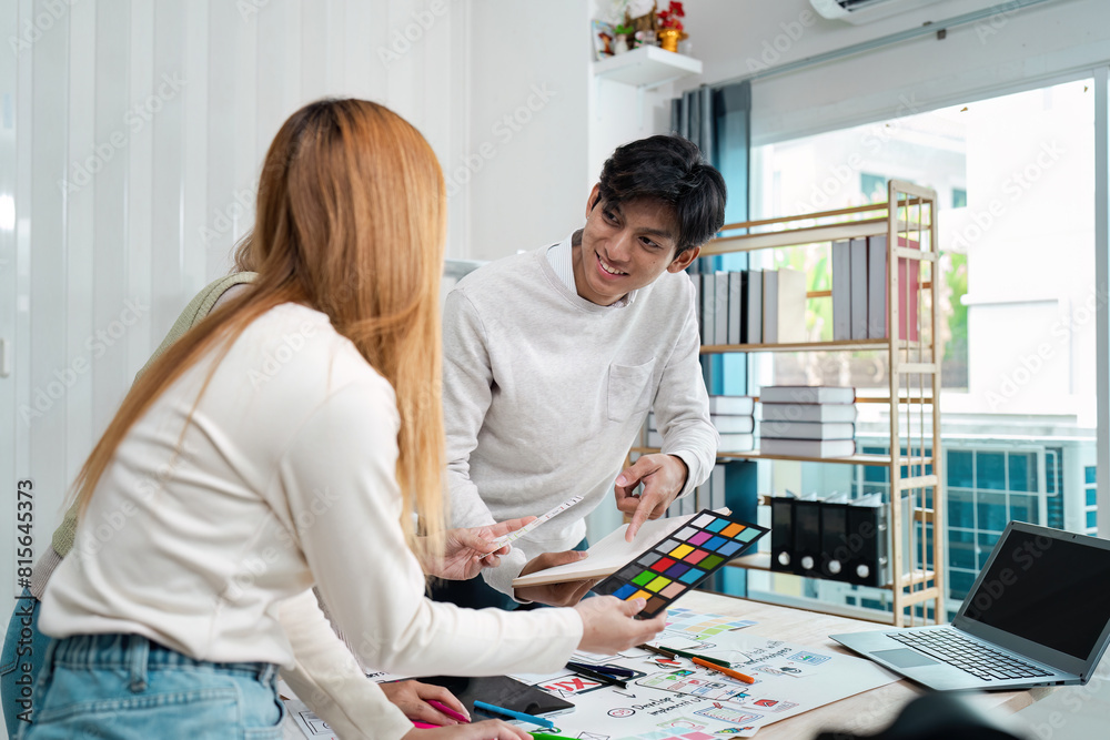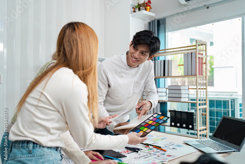 Wall mural : Ui designers present to team about color design of logo during application design brainstorming - cre