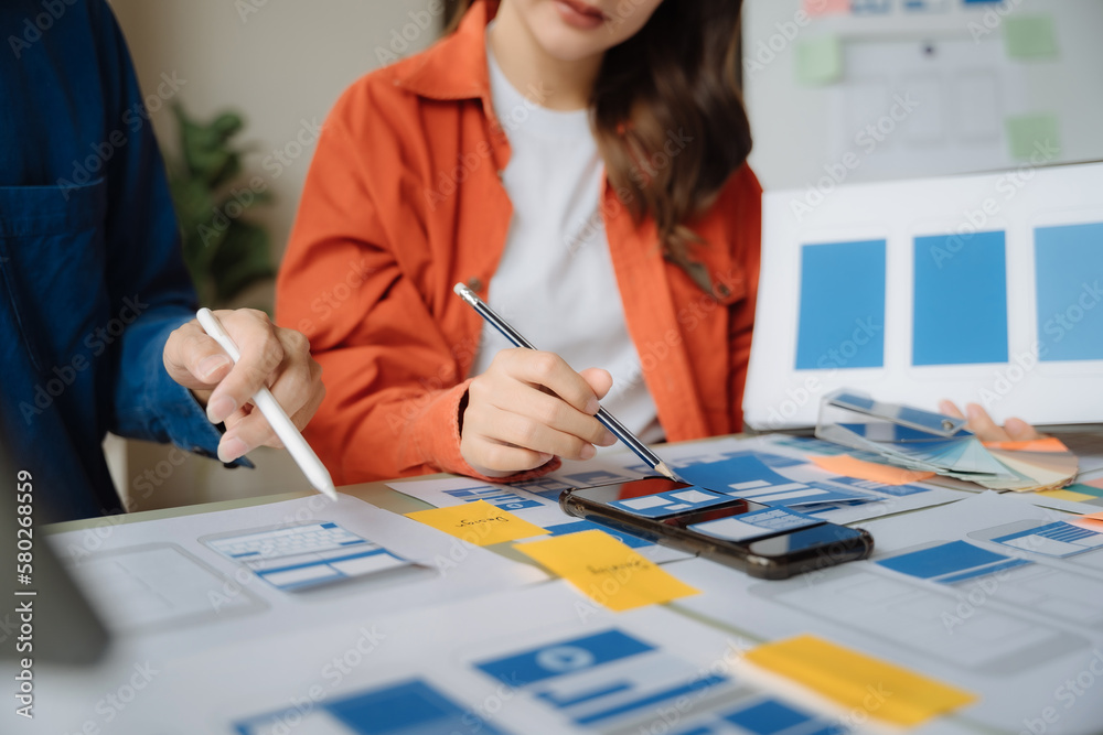 Wall mural : Ui developer and ui designer brainstorming about mobile app interface wireframe design with customer