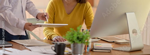 The watermark will not be included on Wall mural.: Ui developer team consulting on their project with digital tablet, computer and paperwork