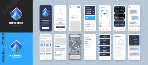 Wall mural : Ui ux mobile app template with blue shield gradient logo and bright background