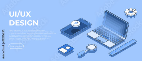 Wall mural ui uxdesign isometric scene. creation of the user interface. modern vector illustration isometric st
