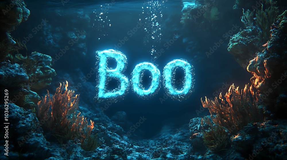 The watermark will not be included on Wall mural.: Underwater mystique exploring the enigmatic depths of the ocean with the ethereal glow of 'boo' in a