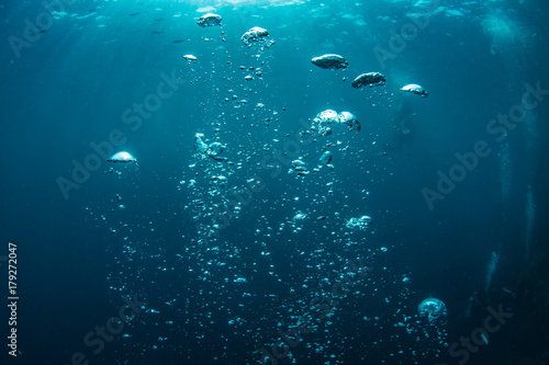 Wall mural : Underwater shot of blue ocean water, air bubbles closeup, sunbeams on water surface, some scubadiver