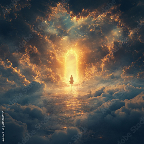 The watermark will not be included on Wall mural.: Unlocking new realms with generative ai while standing before a golden doorway in a celestial landsc