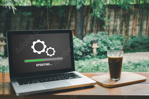 Wall mural : Update progress concept, person waiting for installing update process with loading bar icon on virtu