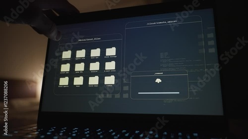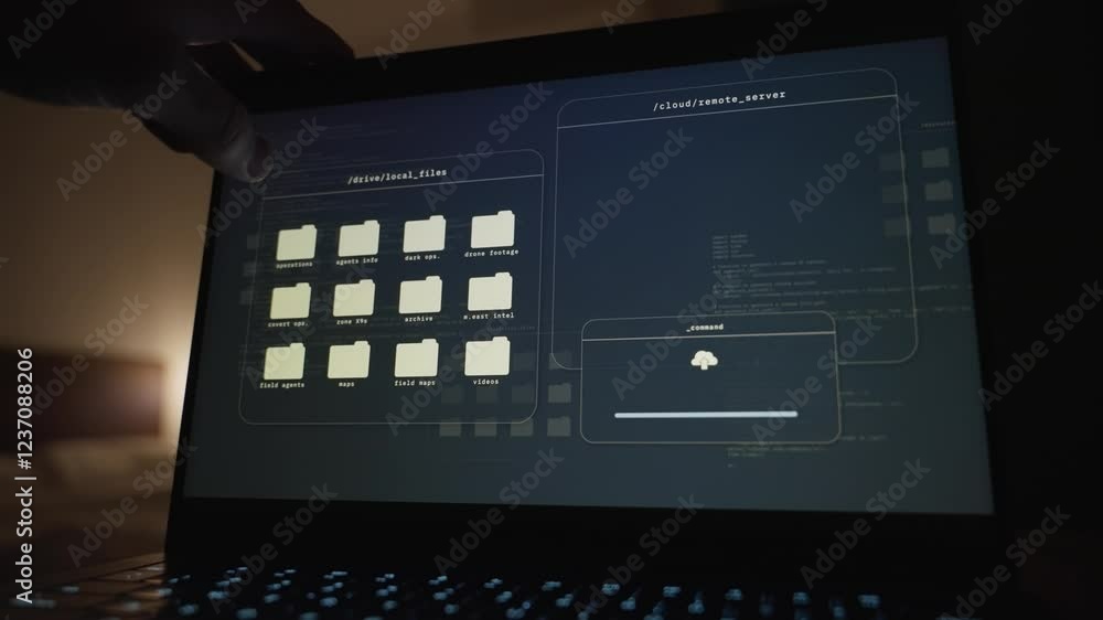 The watermark will not be included on Wall mural.: Uploading classified info and documents to remote server using laptop in room - dark hotel suite wher
