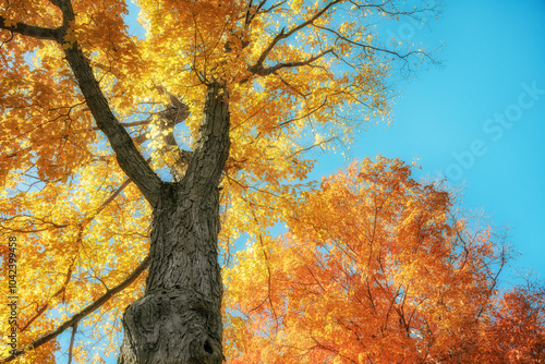Wall mural : Upward view of large maple trees with bright orange and golden yellow autumn foliage leaves against