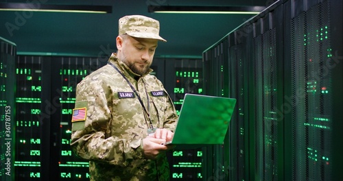 Wall mural us army male caucasian officer in uniform and cap stading at server wih secret data and using laptop
