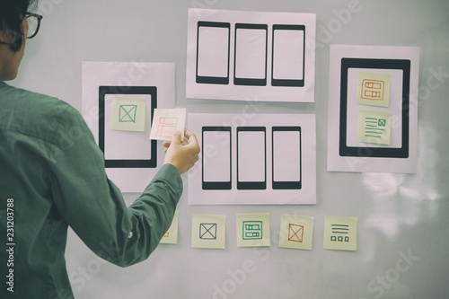 Wall mural : User experience ux designer designing web on mobile phone tablet layout - ui planning mobile applicat