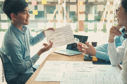 Wall mural : User experience ux designer designing web on smart phone layout - ui developer planning working on mo