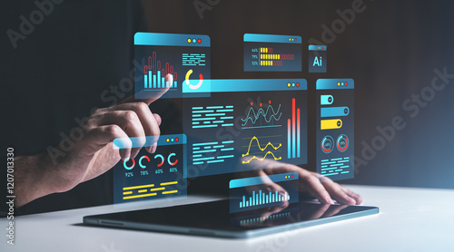 Wall mural : User interacting with futuristic data visualization interface on tablet -
