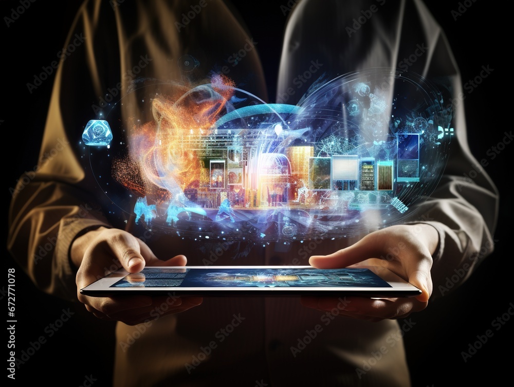 Wall mural using tablet computer shows internet and social network
