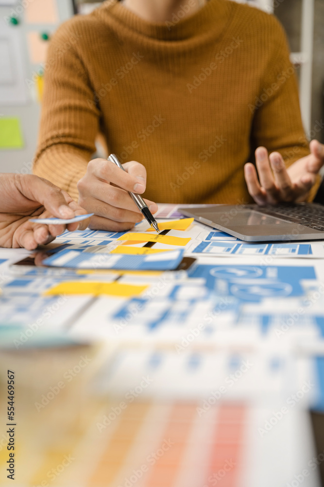 Wall mural ux, ui developer and ui designer brainstorming about mobile app interface wireframe design with cust - Wall murals Wall mural ux, ui developer and ui designer brainstorming about mobile app interface wireframe design with cust - Wall murals