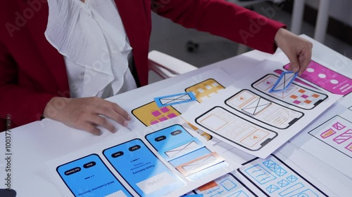 The watermark will not be included on Wall mural.: Ux designer arranging wireframe sketches for a new mobile application prototype, focusing on user ex