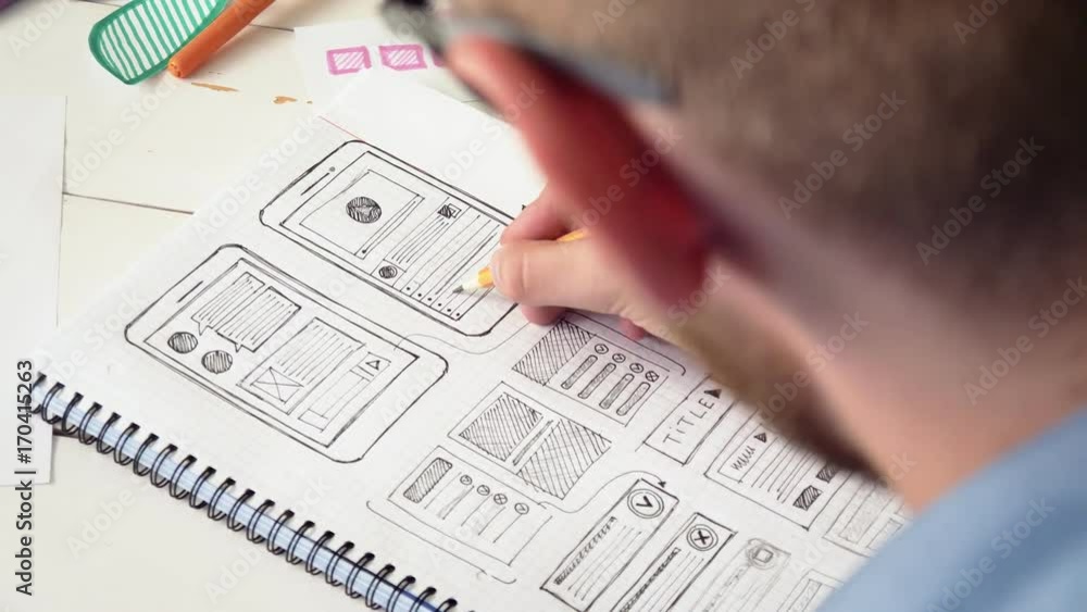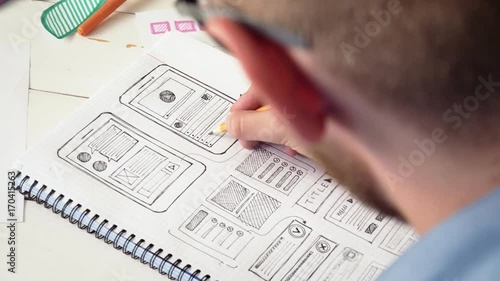 Wall mural ux designer sketching prototype of a new app in his notebook - Wall murals Wall mural ux designer sketching prototype of a new app in his notebook - Wall murals