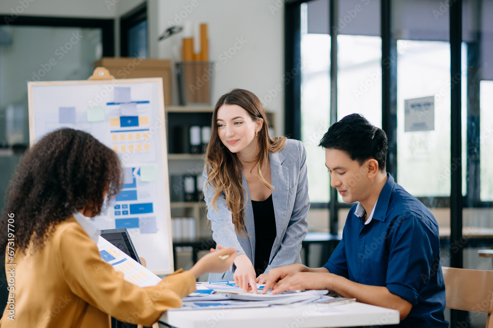 Wall mural : Ux developer and ui designer brainstorming about mobile app interface wireframe design with customer