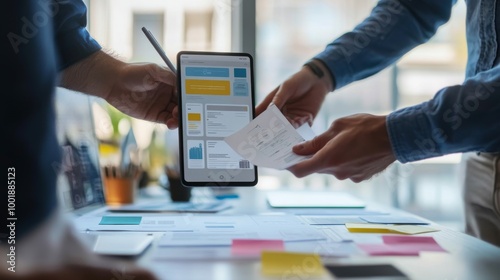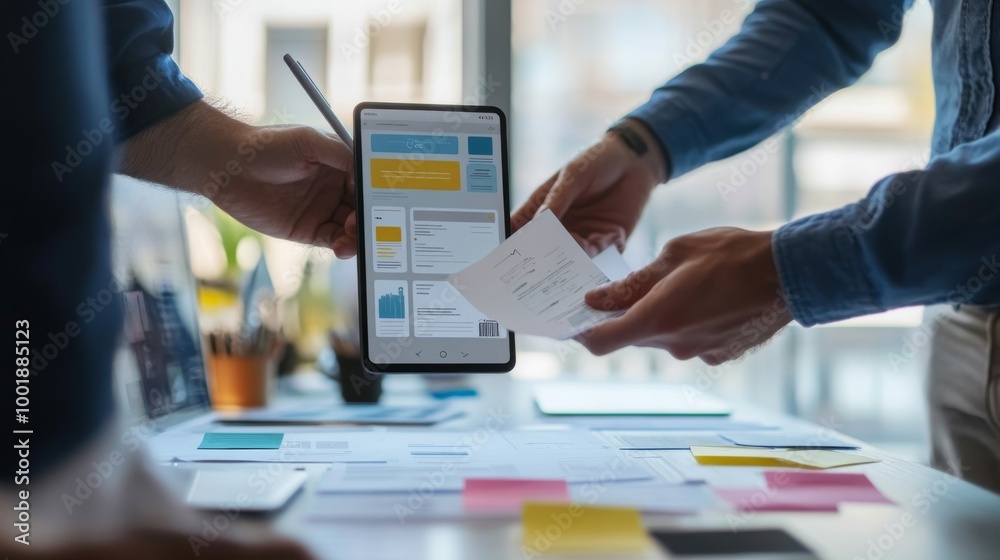 The watermark will not be included on Wall mural.: Ux developer and ui designer brainstorming about mobile app interface wireframe design with customer