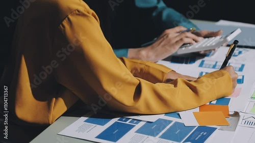 The watermark will not be included on Wall mural.: Ux developer and ui designer brainstorming about mobile app interface wireframe design with customer