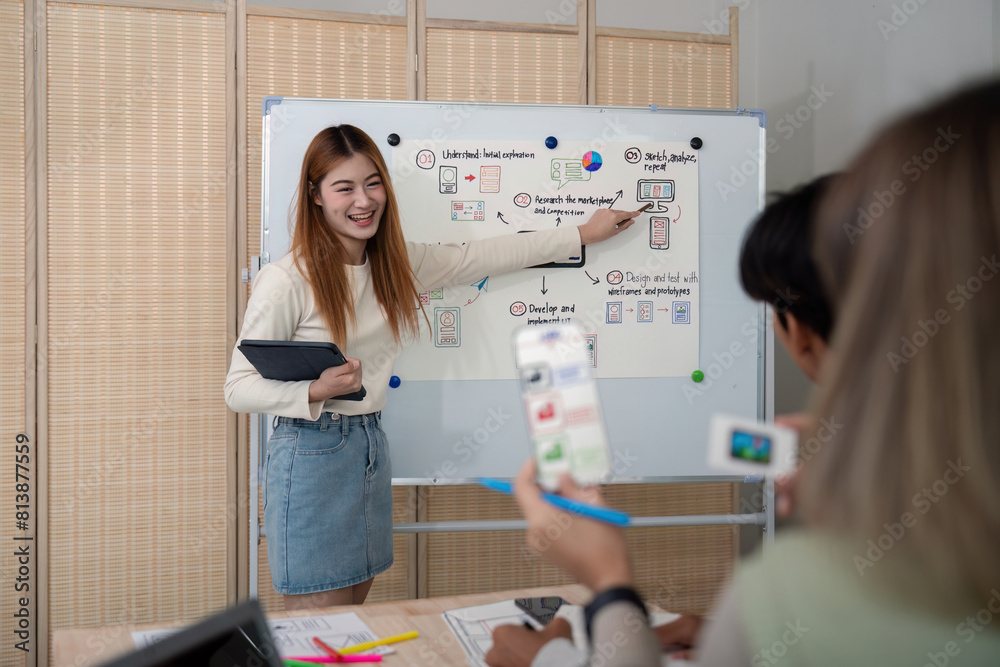 Wall mural ux developer and ui designer presenting mobile app interface design on whiteboard in meeting at offi - Wall murals Wall mural ux developer and ui designer presenting mobile app interface design on whiteboard in meeting at offi - Wall murals