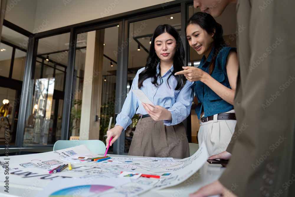 Wall mural : Ux developer and ui designer presenting mobile app interface design on whiteboard in meeting at offi