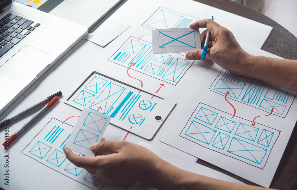 Wall mural : Ux graphic designer creative sketch planning application process development prototype wireframe for