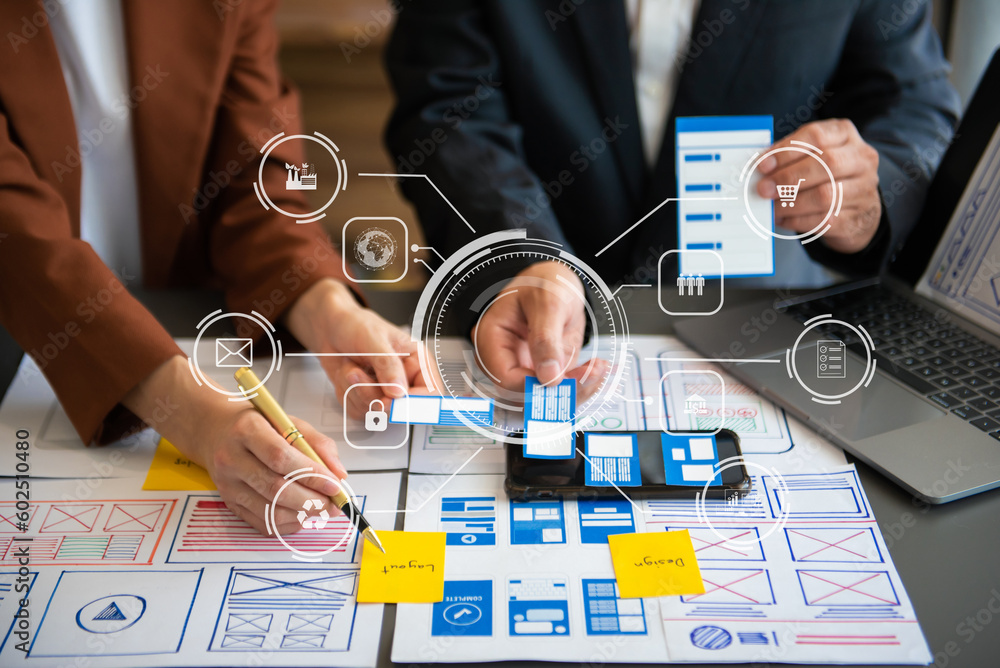 Wall mural : Ux graphic designer planning application process development prototype wireframe for web smart phone