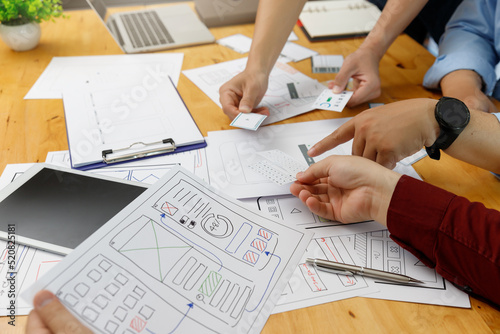 Wall mural : Ux ui concept, graphic designers work together with ux ui designer planning application template lay