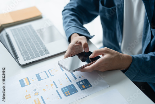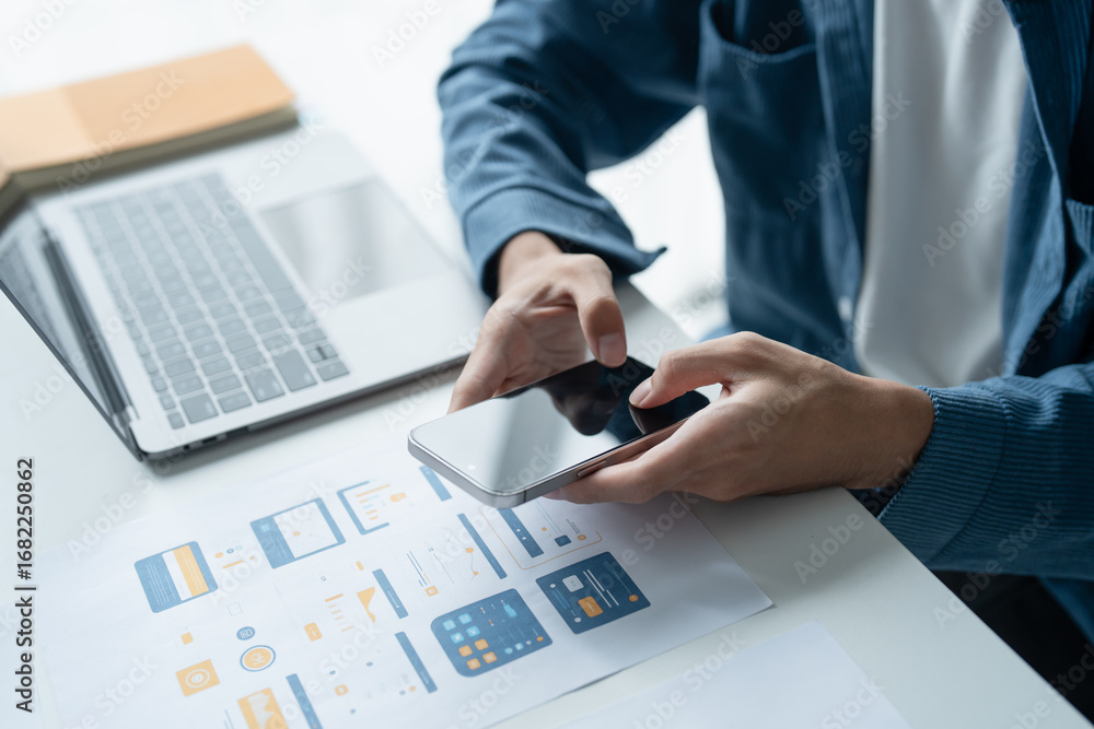 Wall mural ux ui designer planning innovative mobile app with paper wireframe designs at workspace. - Wall murals Wall mural ux ui designer planning innovative mobile app with paper wireframe designs at workspace. - Wall murals