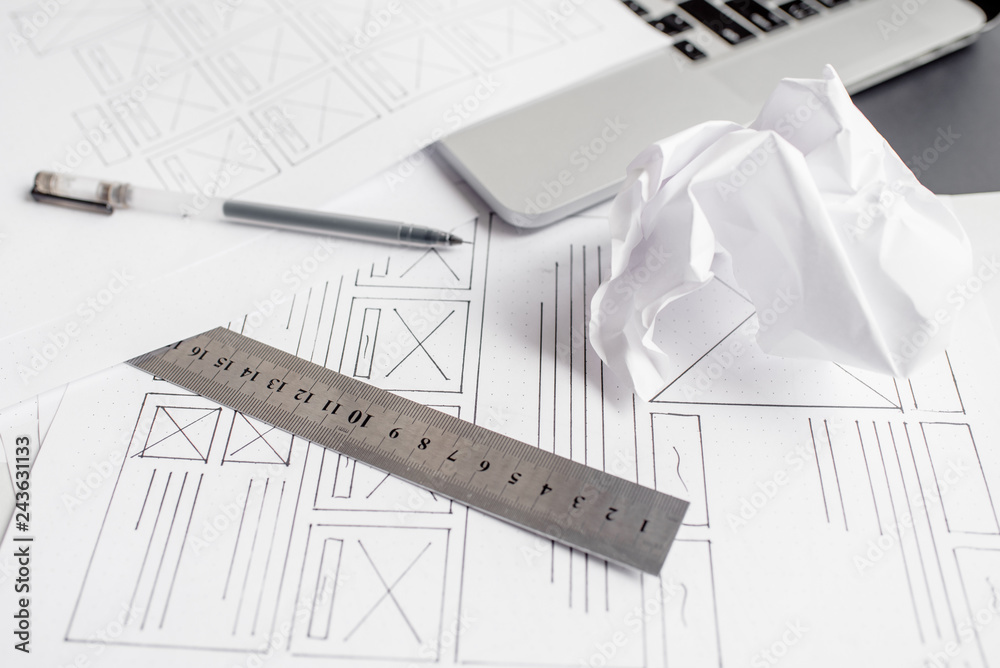 Wall mural : Ux website designer drawing wireframe sketch of prototype, framework, layout future project - creativ