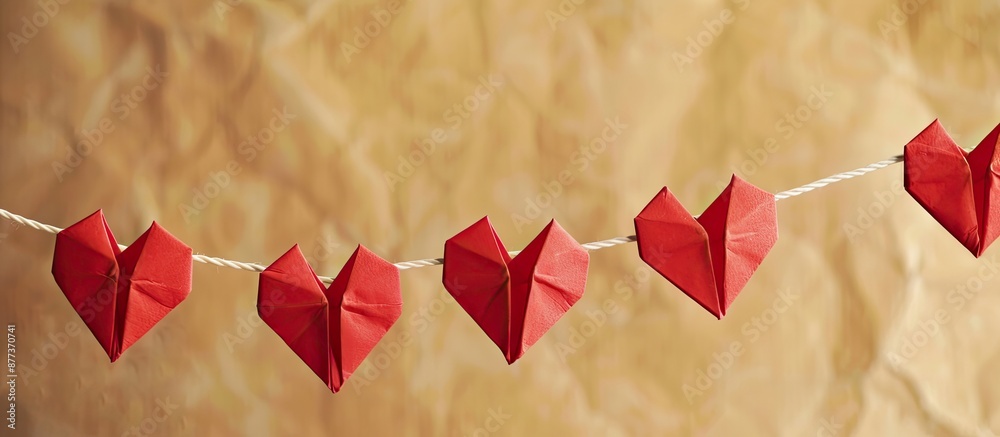 The watermark will not be included on Wall mural.: Valentine s day theme with red origami hearts on a string against a paper backdrop ideal for text in