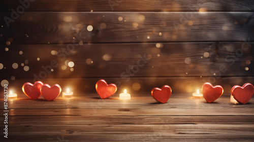 Wall mural valentines day background with heart shaped lights and candles on wooden table., generative ai