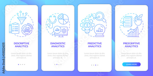 Wall mural : Variety of data analytics blue gradient onboarding mobile app screen - walkthrough 4 steps graphic in
