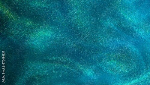 Wall mural various stains and overflows of gold particles in green fluid with blue tints. golden particles dust