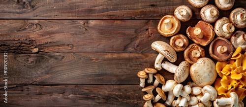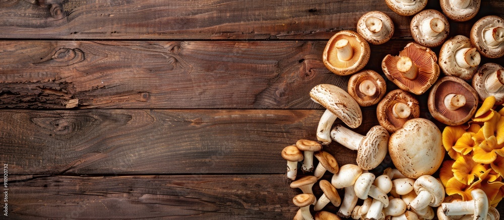 Wall mural : Various types of edible mushrooms displayed on a wooden table with copy space image